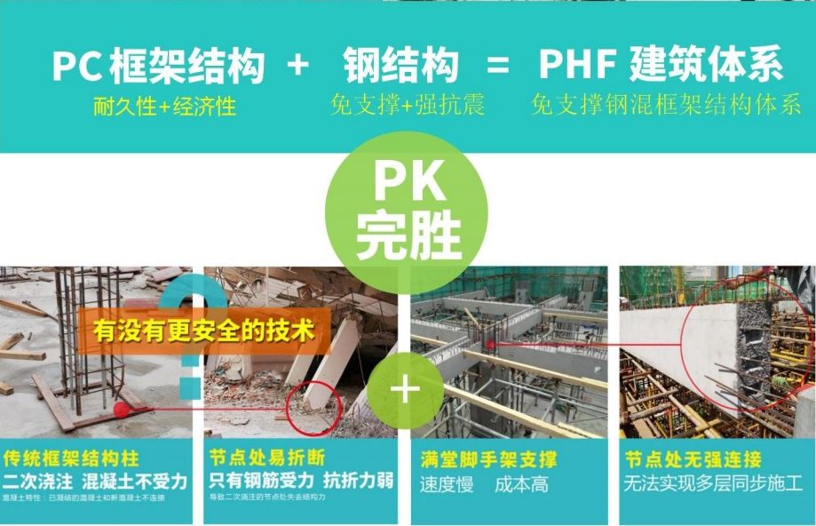 PHF建筑體系將 PC 構(gòu)件與鋼結(jié)構(gòu)連接方式有機結(jié)合、混合應用,綜合了傳統(tǒng) PC 結(jié)構(gòu)和鋼結(jié)構(gòu)的優(yōu)勢,揚長避短,施工更高效、效益更顯著。為行業(yè)開辟了一條新的賽道。