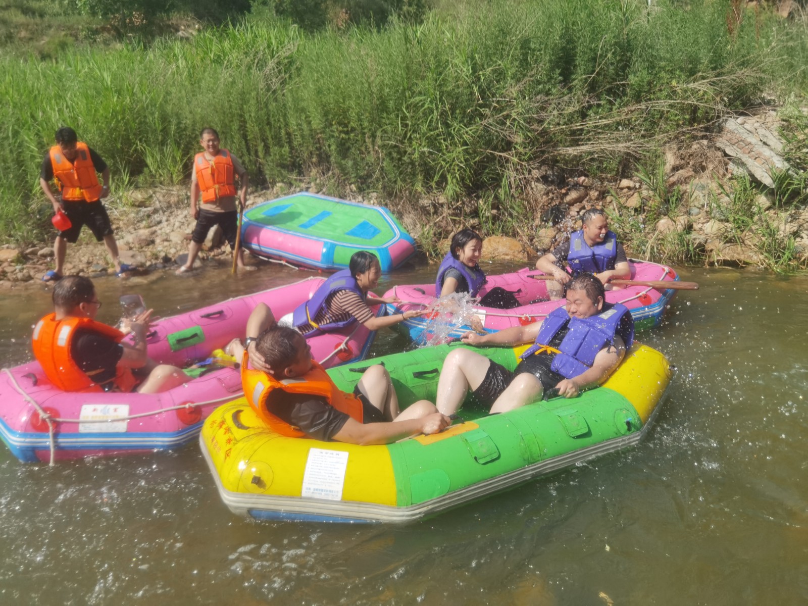 等來(lái)到流速不快的淺灘時(shí),大家卸下緊張和疲憊,或躺或坐在船上,愜意地曬起了日光浴。還有的在河里打起了水仗,一時(shí)間水花翻飛,戰(zhàn)況激烈。清涼的河水刺激著每一個(gè)人的神經(jīng),尖叫聲、歡笑聲響徹整個(gè)河谷,盛夏的炎熱和身心的疲憊也在此刻煙消云散。